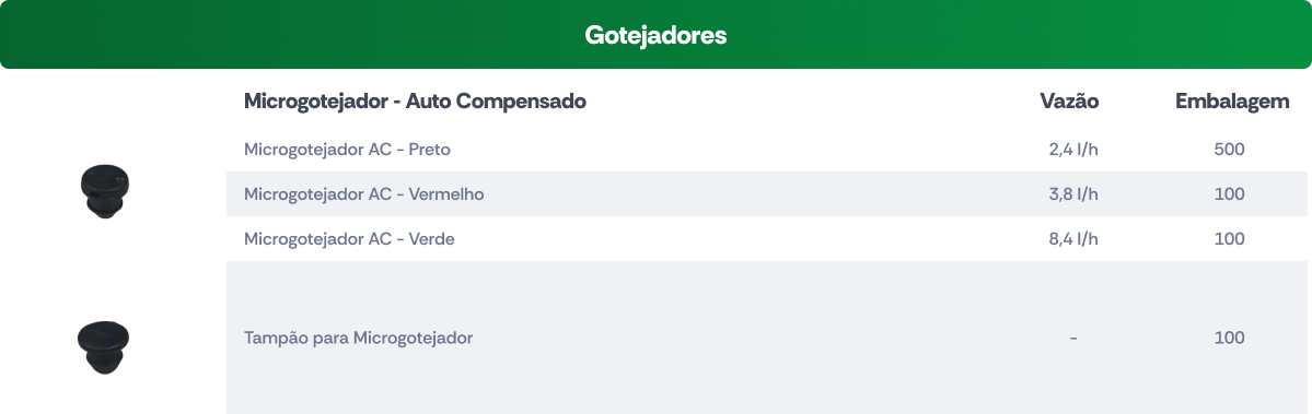 Disponíveis em diversas cores e vazões, são perfeitos para sistemas de irrigação por gotejamento, oferecendo alta precisão na distribuição de água.